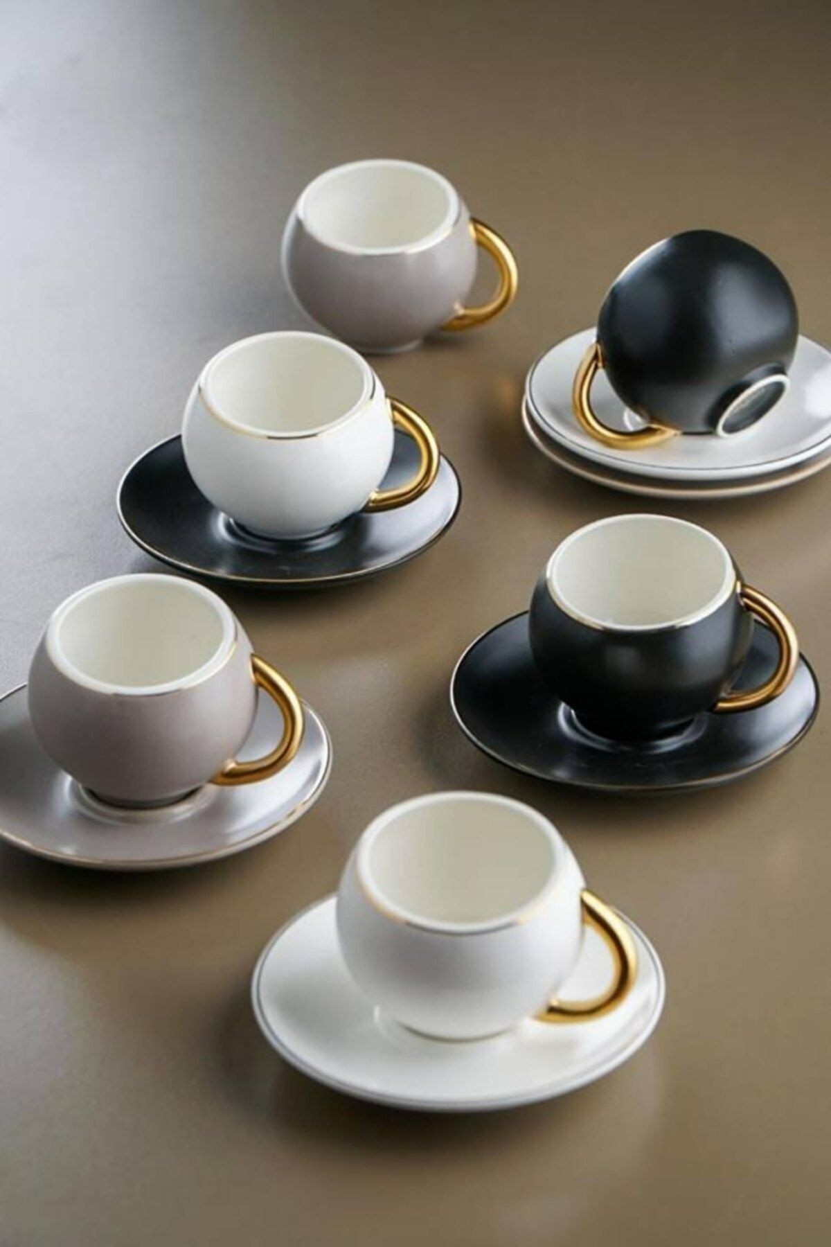 Kahve keyfinizi estetik bir sunuma dönüştürecek olan Tokyo Porselen Kahve Fincan Takımı, alışılagelmişin dışında duran tarzı ve modern yapısı ile göz dolduracak. Enine geniş yuvarlak alt kısmında tasarlanan çıkıntı, katlı duruşu ile kendine hayran bırakıyor. İnce detay sevenler için ağız çerçevesinde bulunan altın rengi ince şerit detayı ve altın fincan kulpu, kahve fincanını elinize aldığınızda zarafeti ve inceliği hissedeceksiniz. 6 kişilik kahve fincan takımını tamamlayan, kahve tabağı çukur yapısı ve tabağın çerçevesinde bulunan altın rengi çizgi şeridi göz doldurmaktadır. Sevdikleriniz ile beraber yapacağınız kahve sohbetlerinizin keyfini iki katına katlamak isteyenler için, Tokyo Porselen Kahve Fincan Takımı gözde fincan setlerinizden biri olacak.