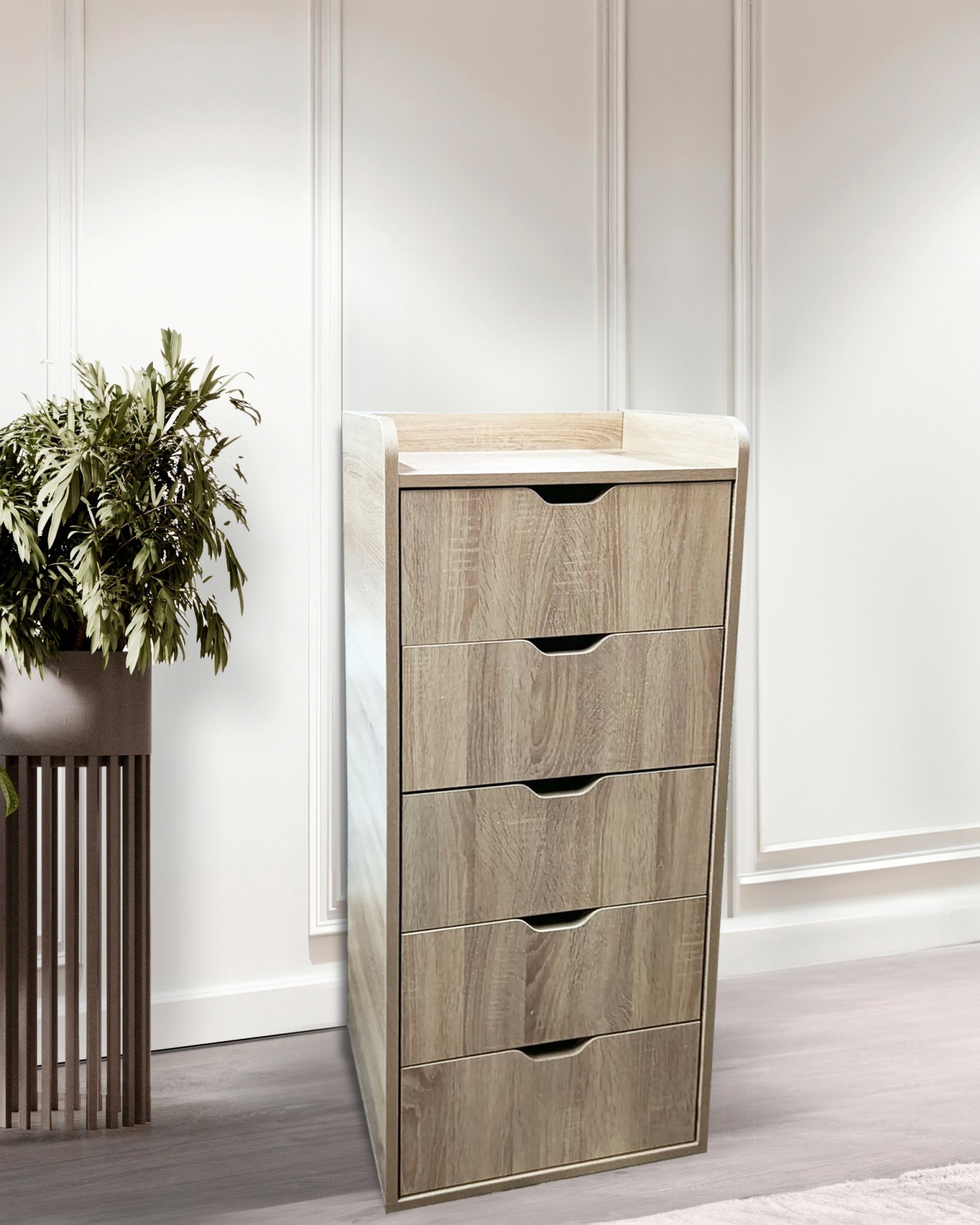 Chancolye Nova Şifonyer, modern çizgilerle tasarlanmış estetik görünümü ve fonksiyonel yapısıyla evinizin düzenini şıklıkla buluşturur. Çelik Kardeşler VIP farkıyla sunulan bu şifonyer, doğal ahşap desenleri ve siyah çerçeve detaylarıyla hem modern hem de sıcak bir atmosfer yaratır. Dört geniş çekmecesiyle giysilerden kişisel eşyalarınıza kadar her şeyi düzenli ve kolay erişilebilir şekilde saklamanızı sağlar.