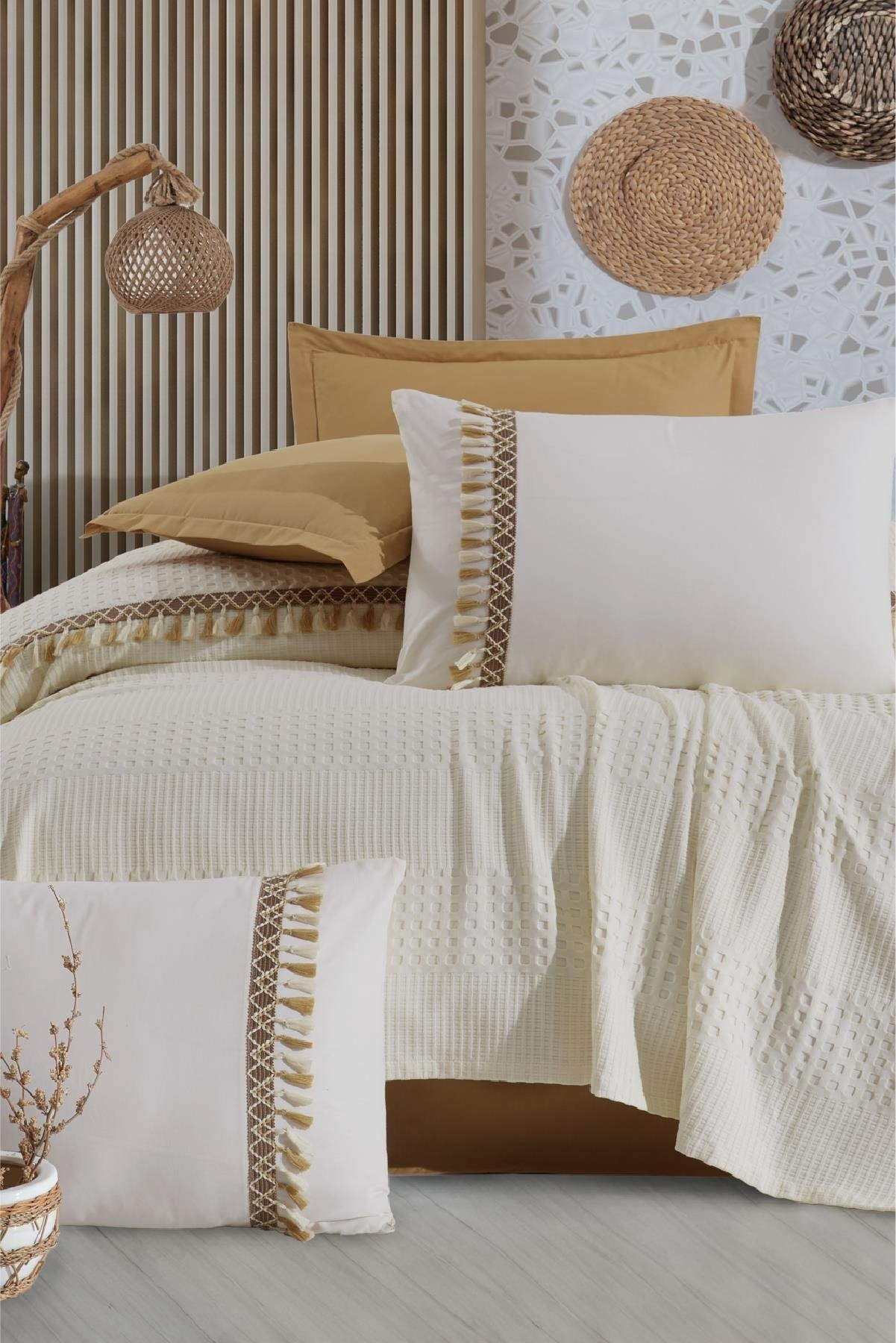 Ekru rengin huzur veren tonlarını bohem çizgilerle buluşturan bu pike takımı, yatak odanıza doğal bir ferahlık ve şıklık kazandırır. Hem genç odalarına hem misafir odalarına uyum sağlayan tasarımıyla her zevke hitap eder.