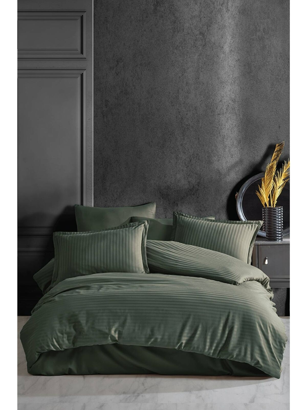 HesabımClasy %100 Pamuk Çizgili Saten Nevresim Takımı Çift Kişilik Düz Renk Haki, zarif çizgili deseni ve doğadan ilham alan haki rengiyle yatak odanızda sofistike bir hava estiriyor. %100 pamuk saten iplikten üretilmiş yapısı ile yumuşacık ve nefes alabilen dokusu sayesinde sağlıklı, konforlu bir uyku deneyimi sunar.