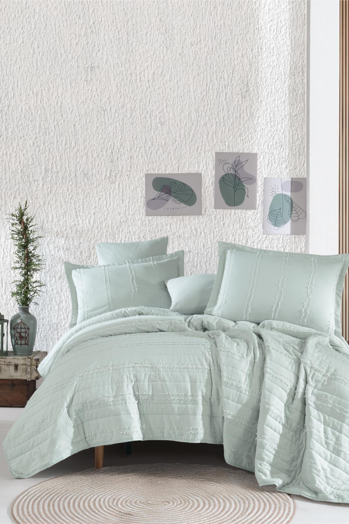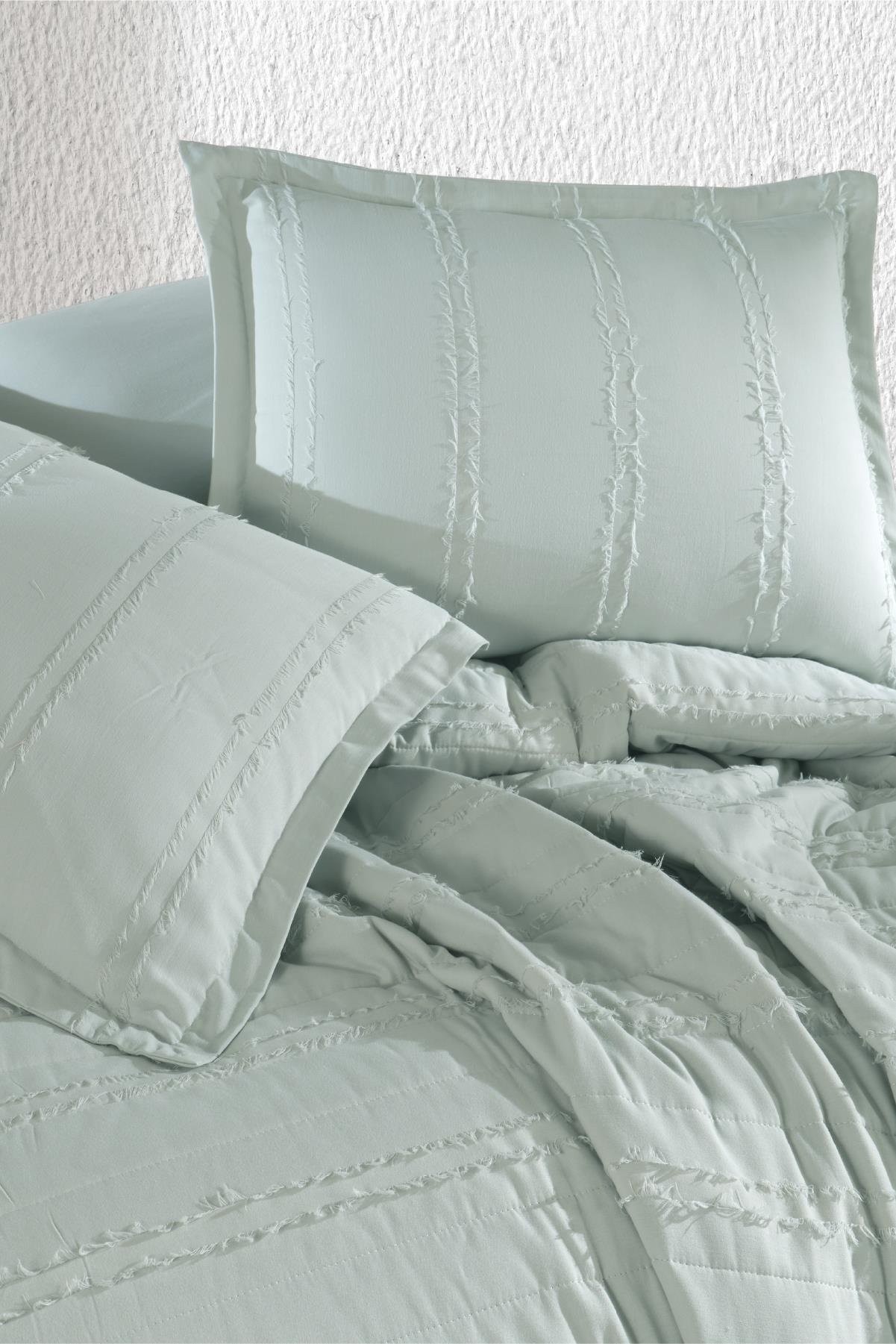 Doğal pamuk dokusu ve şık püsküllü tasarımıyla hem yazın pike hem de bahar aylarında yatak örtüsü olarak kullanabileceğiniz çok amaçlı bir settir.