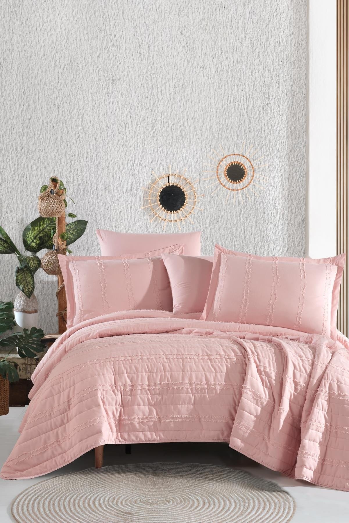 Doğal pamuk dokusu ve şık püsküllü tasarımıyla hem yazın pike hem de bahar aylarında yatak örtüsü olarak kullanabileceğiniz çok amaçlı bir settir.