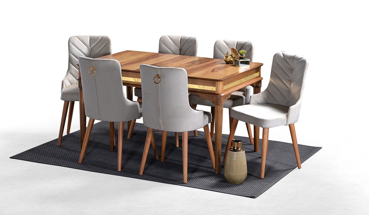 Cool Elkamet Ceviz Masa Takımı, modern tasarımı, estetik ceviz cilalı görünümü ve fonksiyonel kullanım özellikleri ile yemek alanlarınıza zarif bir dokunuş katar.