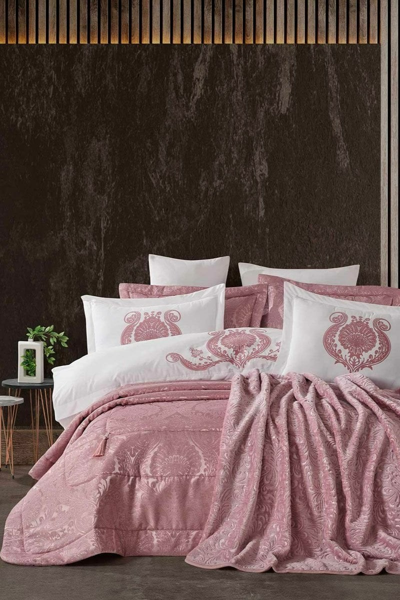 Bu lüks ve kapsamlı çeyiz paketi, evinizin yatak odası, banyo, mutfak ve yemek alanı gibi birçok bölümünü kapsayan kaliteli ürünlerden oluşmaktadır. Gülkurusu rengiyle zarif ve romantik bir atmosfer yaratırken, %100 doğal pamuk kumaşları sayesinde sağlıklı ve konforlu bir kullanım sunar.