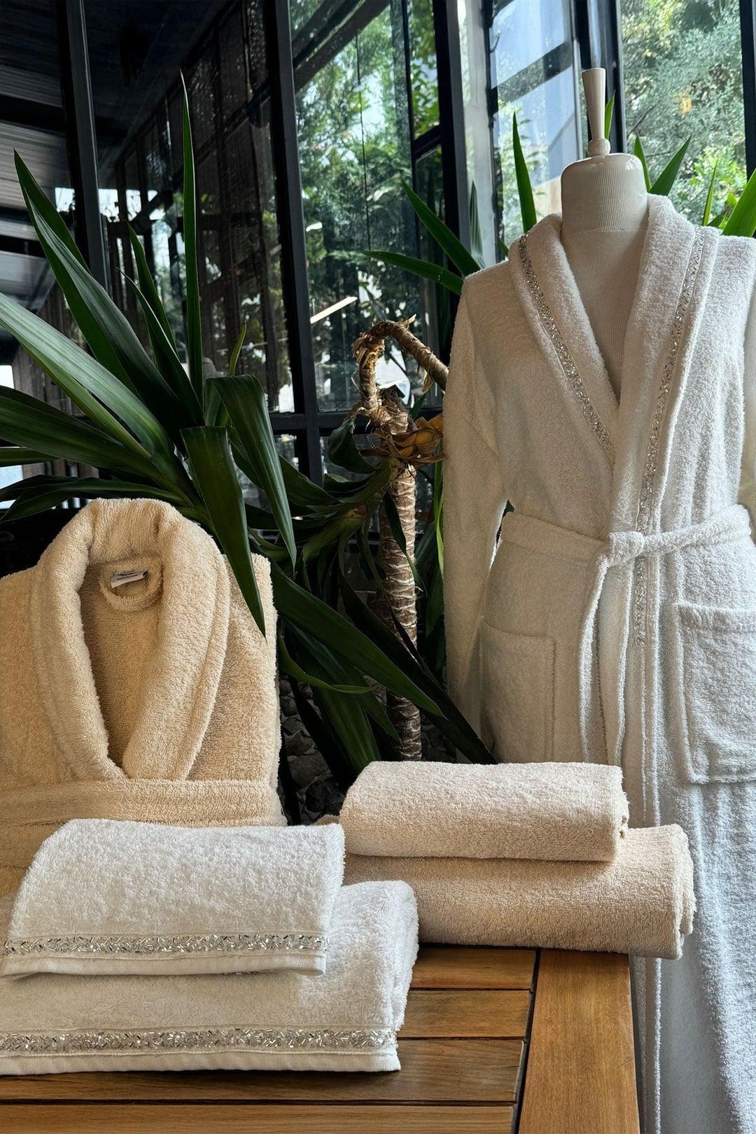 Elart Vals Aile Bornoz Seti 6 Parça Taş, modern tarzı ve ışıltılı detaylarıyla banyo keyfinizi şıklıkla buluşturur.
