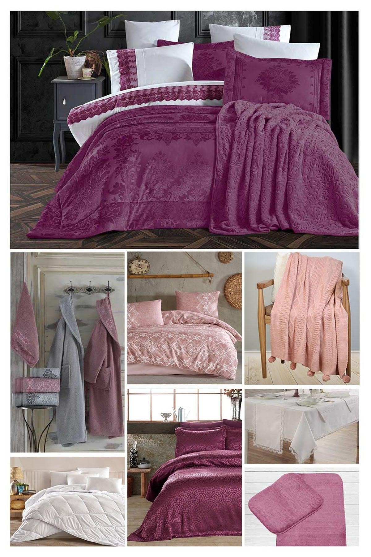 Mürdüm rengi olması da oldukça şık ve asil bir hava katıyor. Aile bornoz seti ile hem kadın hem erkek için uygun ölçülerde bornoz ve havlular bulunması güzel bir detay. Yemek seti, masa örtüsü, runner ve peçete yüzükleriyle sofralar da şık hale getirilebiliyor.