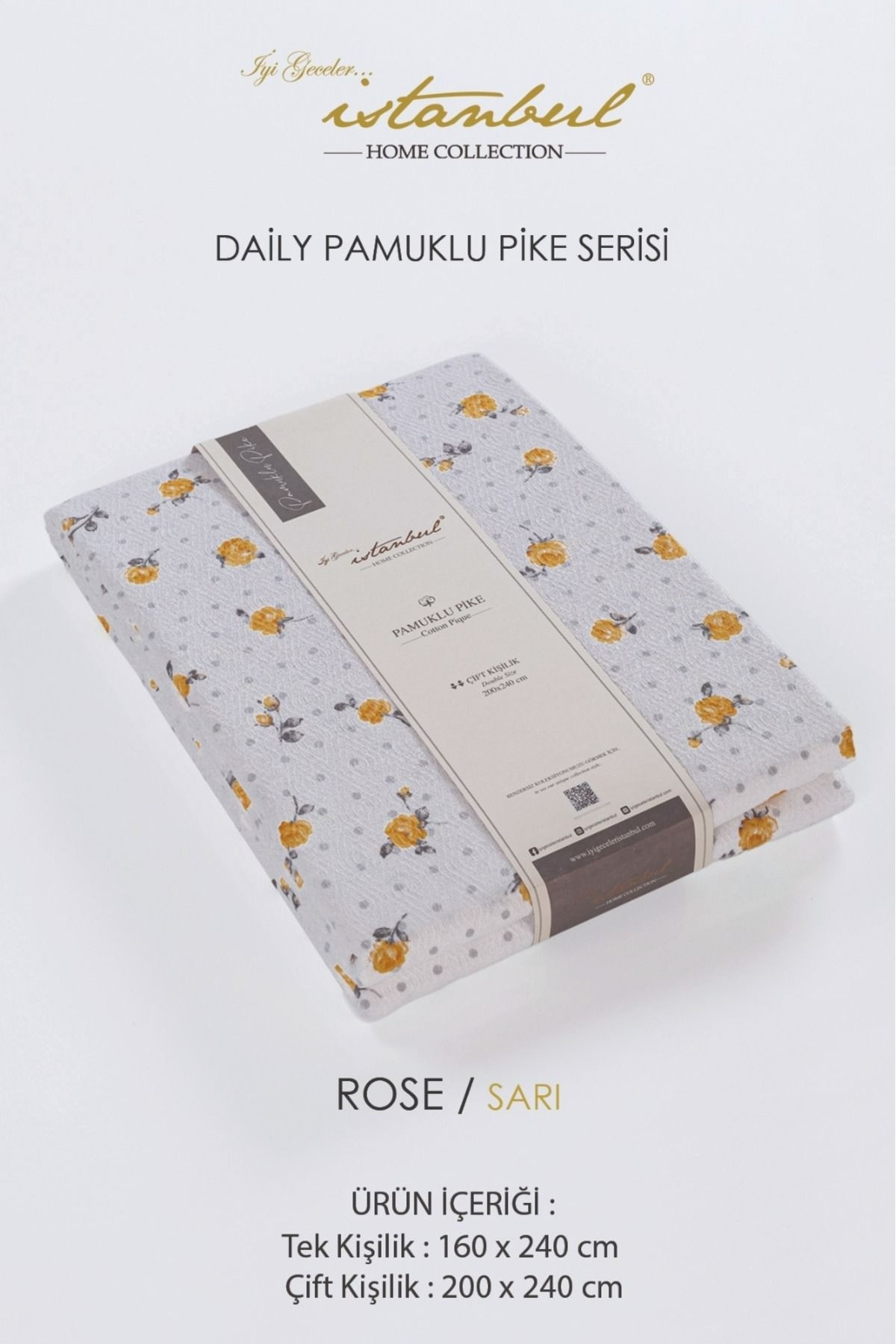İyi Geceler İstanbul Daily Çift Kişilik Pike Rose, zarif tasarımı ve yumuşak dokusuyla yatak odalarınıza romantik bir hava katıyor. Günlük kullanıma uygun pamuklu kumaşı sayesinde konforlu bir uyku deneyimi sunar. Sezonun en trend renkleri ve desenleriyle üretilen bu pike, hem şıklık hem de rahatlık sağlar.