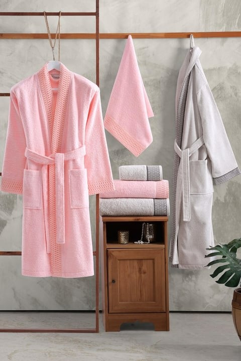 İyi Geceler İstanbul Emily Aile Bornoz Seti, %100 pamuklu dokusu ve kaliteli ring iplik dokuma yöntemi ile sizlere konforlu bir kullanım sunuyor. Hem erkek hem de kadın bornozu ile şıklığı bir arada sunan bu set, aynı renk ve dokudaki havlularıyla banyolarınıza zarif bir dokunuş katıyor.