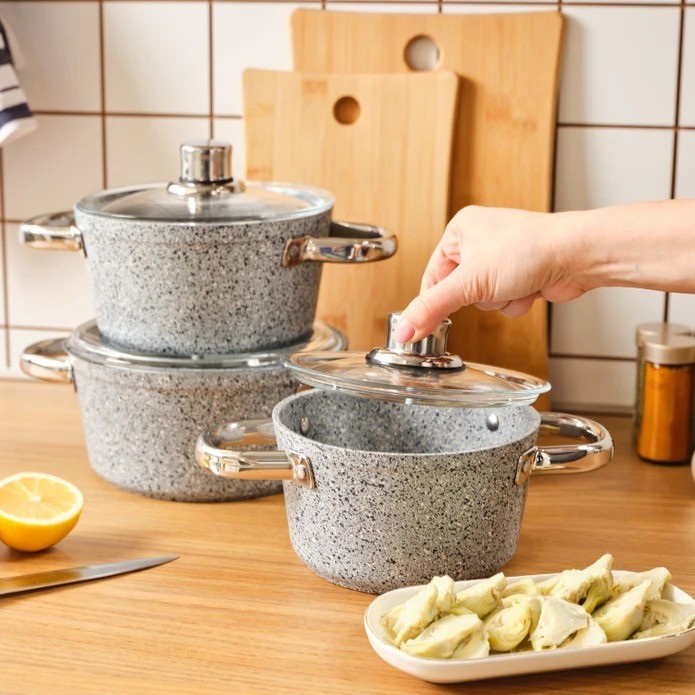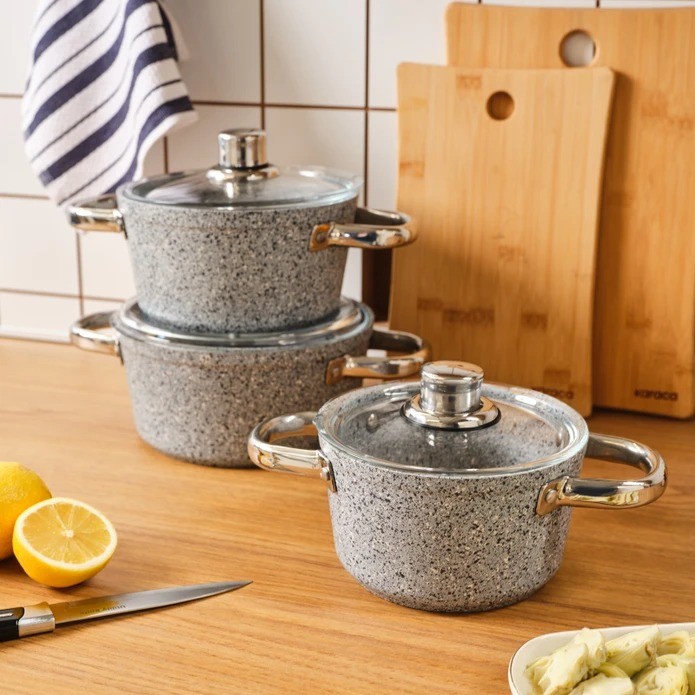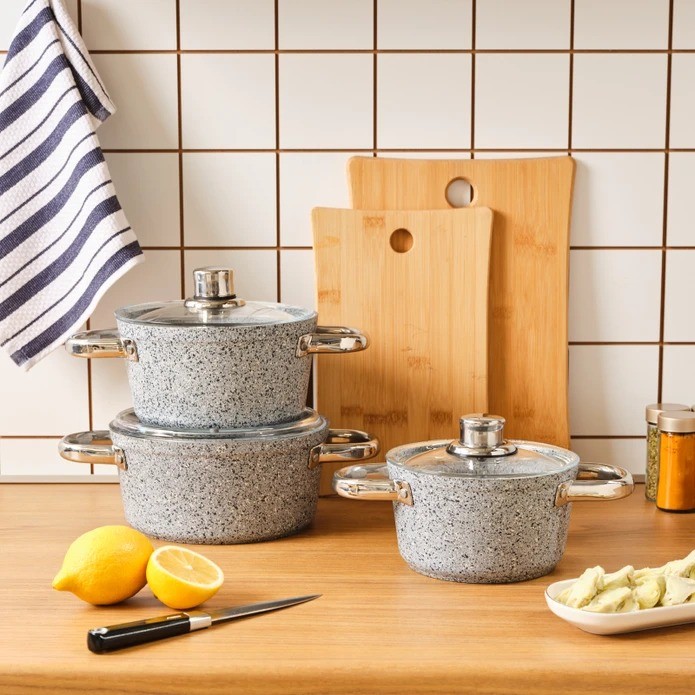 Karaca Biogranit Nare 6 Parça Midi Tencere Seti, estetik ve fonksiyonelliği bir arada sunarak mutfaklarınızda profesyonel sonuçlar elde etmenizi sağlar. Granit görünümlü kaplamasıyla hem şık bir görünüm sunar hem de kullanım sırasında üstün performans sağlar.