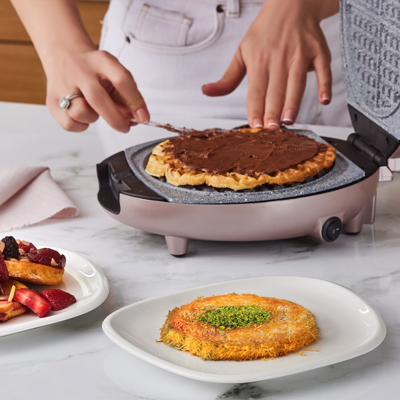 HesabımTürkiye’de bir ilk! Karaca Funday Rosegold Waffle Makinesi, 4 dakikada waffle pişirme hızı ve eşit ısı dağılımı sağlayan granit görünümlü kaplama plakalarıyla mükemmel sonuçlar sunar. Çıkarılabilir ve bulaşık makinesinde yıkanabilir plakaları sayesinde temizlik zahmetsizdir. Değiştirilebilir plakalarıyla waffle, pankek ve künefe yapma imkanı sunarak mutfağınıza pratiklik ve çeşitlilik katar. Çelik Kardeşler VIP farkıyla elden taksit ve uygun fiyat fırsatlarını kaçırmayın!