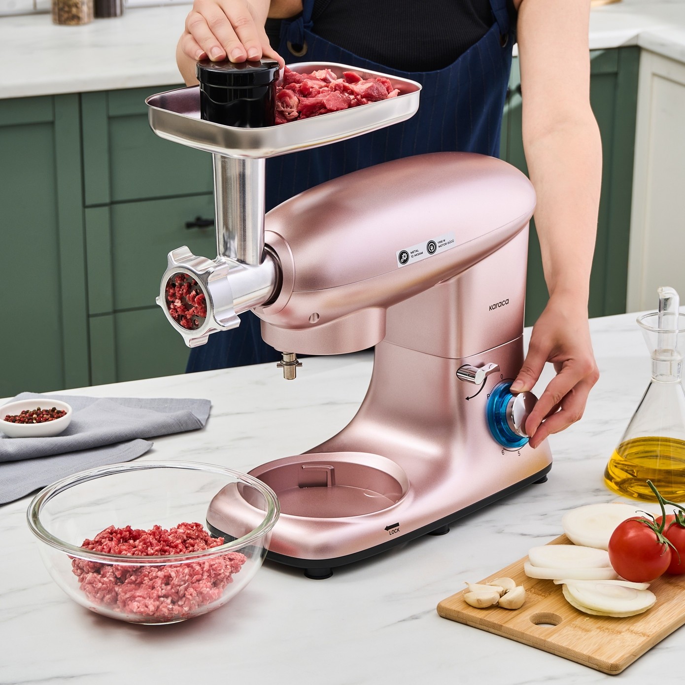 HesabımKaraca Multichef Stand Mikser Rosegold, mutfakta profesyonel bir şef gibi çalışmanızı sağlayacak mükemmel bir mutfak yardımcıdır. 1900W gücünde motoru ile hızlı ve verimli bir şekilde kıyma çekme, sucuk-sosis yapımı, içli köfte hazırlığı gibi zorlu işlemleri kolayca yapabilirsiniz. 5,5 litre paslanmaz çelik kasede geniş hacim sunarak büyük miktarda malzeme hazırlamanıza olanak tanır. 6 kademeli hız ayarı ve yörüngesel hareket etme özelliği ile istediğiniz kıvamda ve hızda karıştırma işlemi yapabilirsiniz.