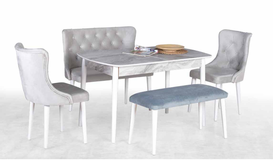 Kelebek Banklı Lam Beyaz Mermer Çam Masa Takımı