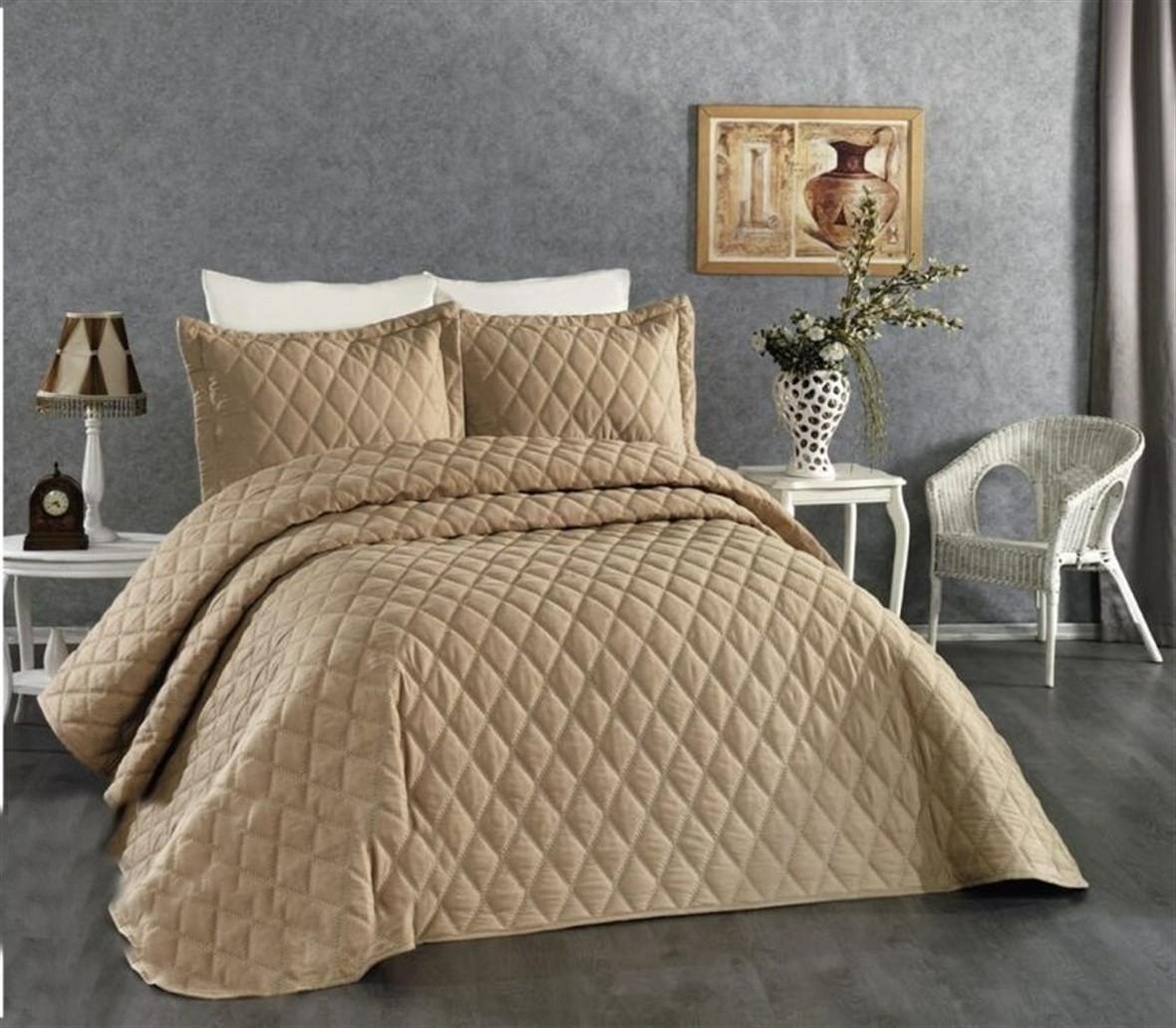 LALIDYA Çift Kişilik Yatak Örtüsü Nare Vizon, modern tasarımı, kaliteli kumaşı ve zarif renk tonlarıyla yatak odanıza değer katacak. Kolay bakımı ile de uzun süre rahatlıkla kullanılabilir. Yatak odanızı şıklıkla tamamlamak için ideal bir seçenek!