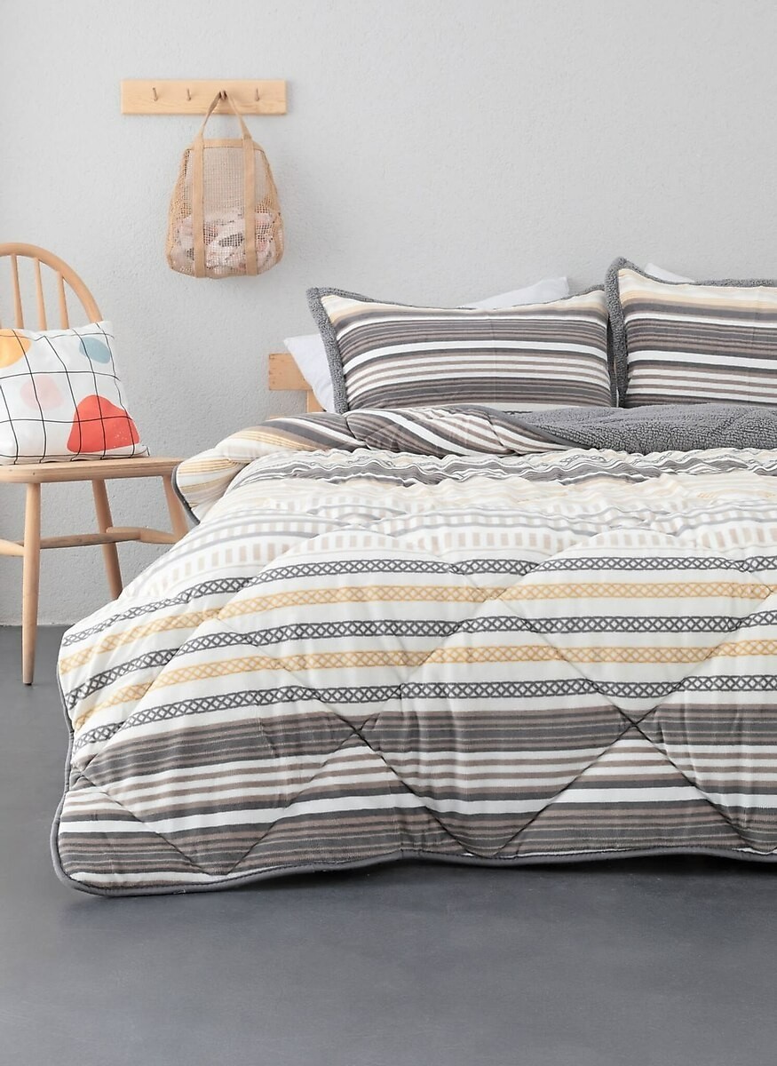 Merinos Comforter Set Çift Kişilik Yorgan Seti, zarif ve sade bej rengi ile yatak odanıza sıcak ve şık bir atmosfer kazandırır. %100 polyester kumaşı ve silikon elyaf karışımı dolgusu sayesinde hafif, yumuşak ve ekstra sıcak tutar. Dayanıklı yapısı ve kolay temizlenebilir özelliği ile uzun yıllar keyifle kullanabileceğiniz bir settir.