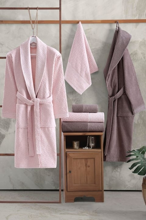 HesabımMonarch Aile Bornoz Seti, %100 pamuklu dokusu ve ring iplik dokuma yöntemiyle kaliteli bir deneyim sunar. Erkek ve kadın bornozları, aynı renk ve dokuda olan havlularıyla banyolarınıza zarif bir dokunuş katarken, günlük kullanımda konforlu bir seçenek oluşturur.