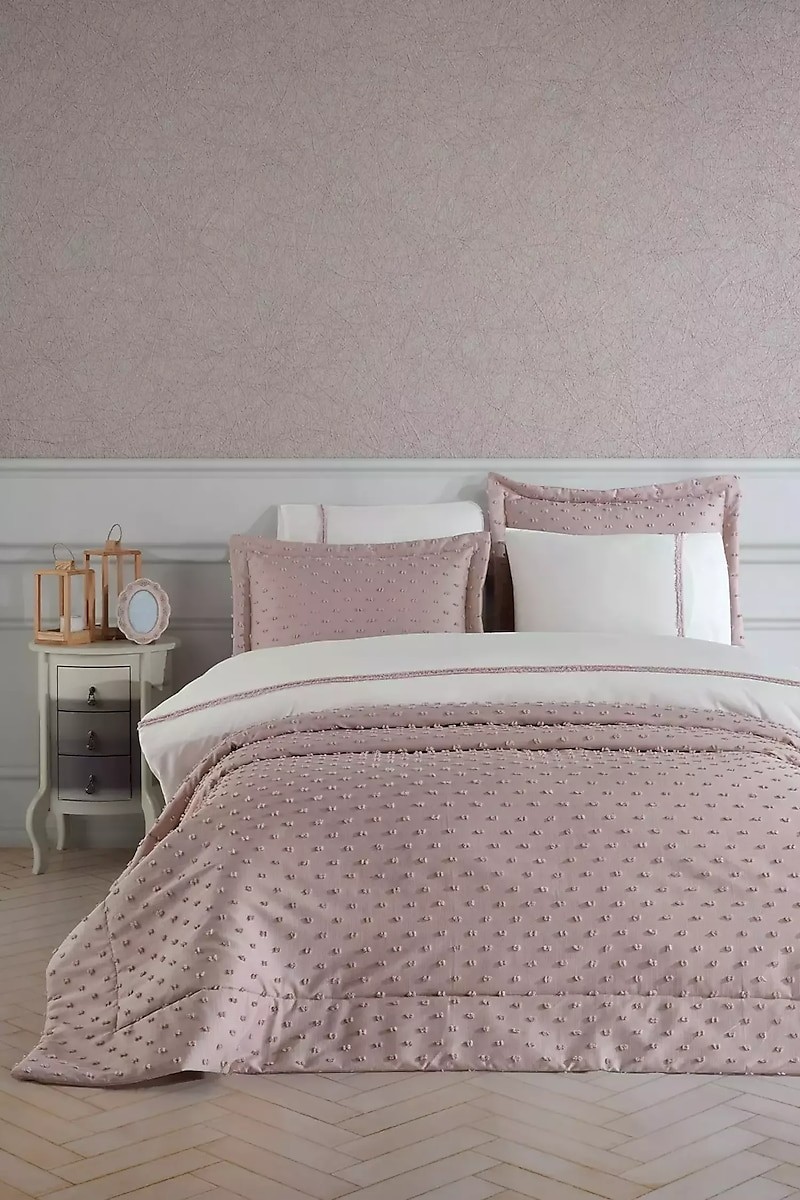 Nora Çeyiz Paketi 7 Parça, yatak odanıza zarif ve şık bir dokunuş katmak için özel olarak tasarlanmıştır. Yüksek kaliteli jakar kesme dokuma kumaşı, estetik desenleri ve dayanıklı yapısı sayesinde uzun ömürlü kullanım sunar. Pamuklu nevresim takımı, nefes alabilen yapısı ve yumuşak dokusu ile konforlu bir uyku deneyimi sağlar. Kullanım kolaylığı sunan fermuarlı nevresimi ve el işçiliğiyle oluşturulmuş zarif desenleriyle çeyizinizin en özel parçalarından biri olacak.