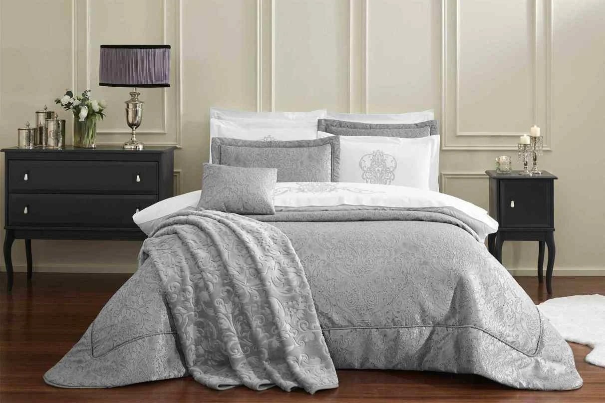 Özdilek Julia Gri Çeyiz Seti, romantik tasarımı ve fonksiyonel yapısıyla hayalinizdeki yatak odasını gerçeğe dönüştürür. Çeyizinize zarafet katmak için ideal tercih!