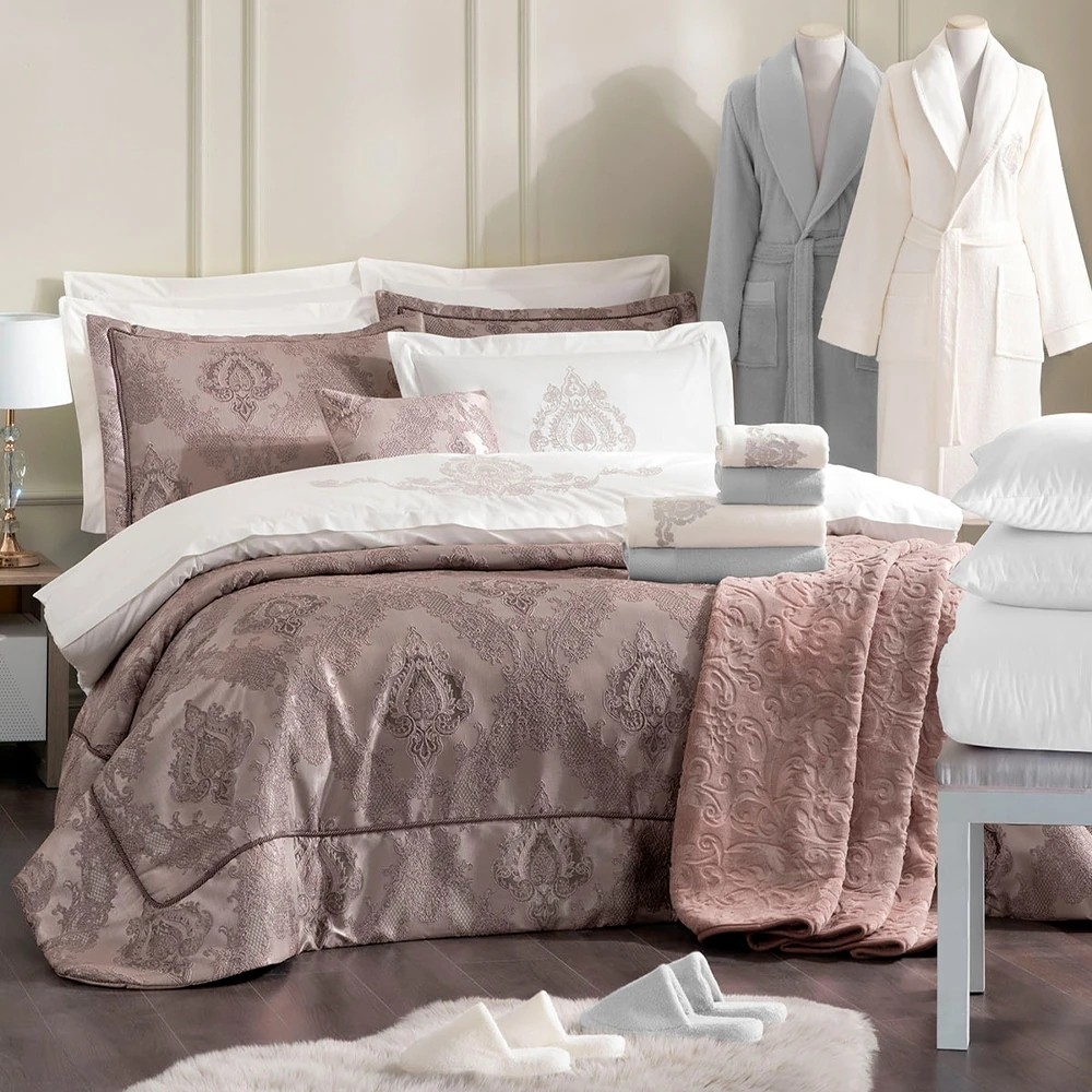 Özdilek Valioso Çift Kişilik Çeyiz Seti 27 Parça Pudra, zarafeti ve şıklığı çeyizinizde bir araya getiriyor. Yumuşak pudra tonları, yatak odanıza romantik ve huzurlu bir hava katarken, pamuk dokusu konforlu bir kullanım sunar. Nevresim takımı ve aile setinde %100 pamuk kumaş kullanılmış olup, sağlıklı ve ferah bir uyku ortamı sağlar. Geniş içeriğiyle yatak odası ve banyo ihtiyaçlarını tek sette toplayan bu özel tasarım set, Çelik Kardeşler VIP güvencesiyle uzun yıllar keyifle kullanabileceğiniz bir çeyiz yatırımıdır.