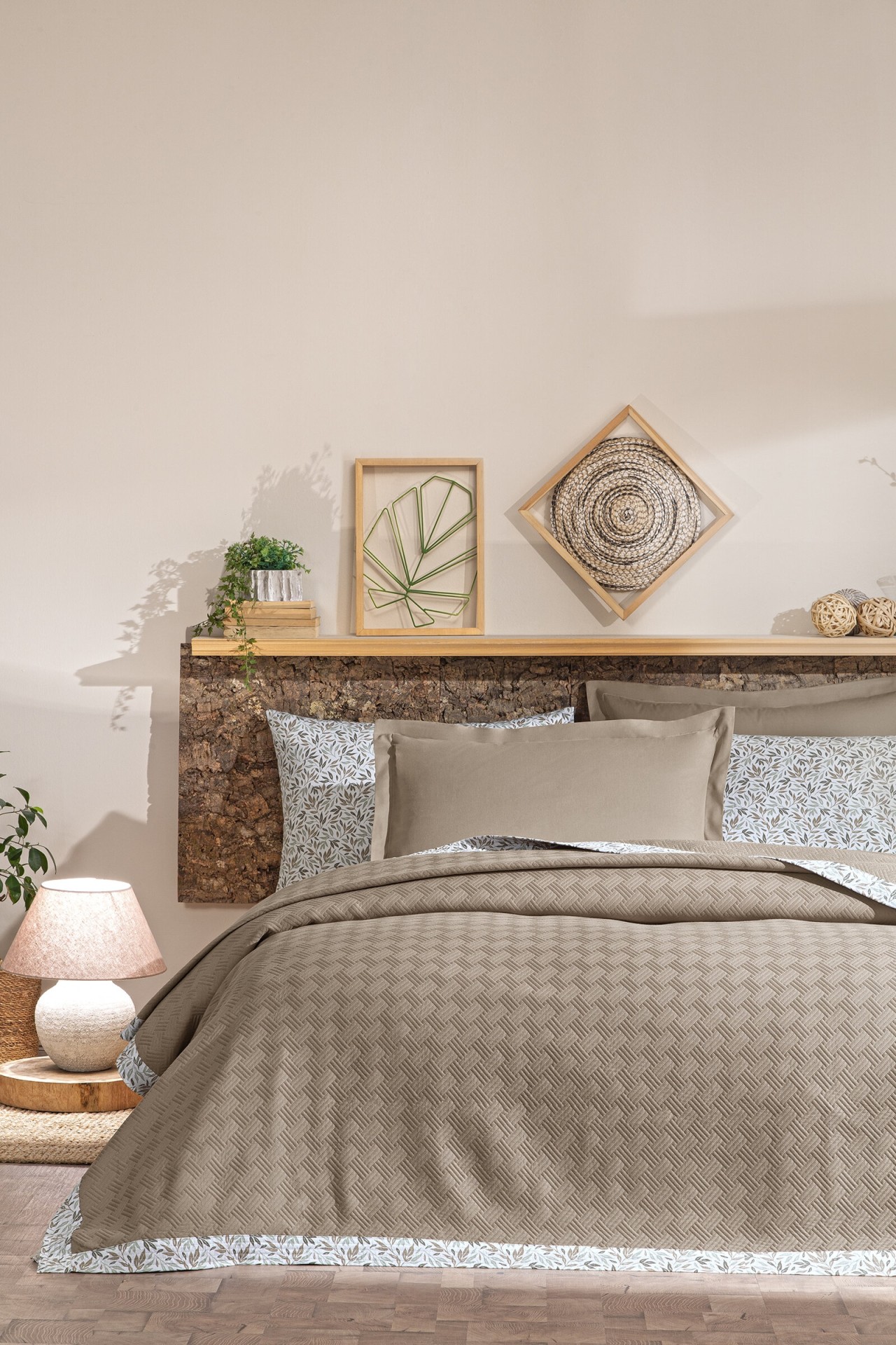 Özdilek Sarmaşık Çift Kişilik Jakar Biyeli Pike Takımı Kahve, zarif kahve tonları ve jakar dokusuyla yatak odanıza doğal bir şıklık katar. %100 pamuklu yapısı sayesinde nefes alabilirlik ve yumuşaklık sunarak dört mevsim boyunca konforlu bir kullanım sağlar. Estetik biyeli kenar detayları ve geniş ölçüleriyle hem dekoratif hem işlevsel olan bu takım, Çelik Kardeşler VIP kalitesiyle sizlere ulaşıyor.