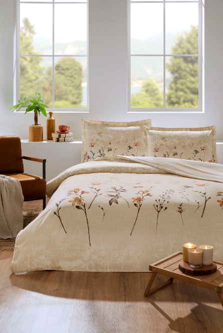 Bu set, çift kişilik yataklar için uygun olup, pamuklu kumaşıyla rahat ve nefes alabilir bir kullanım sunar.