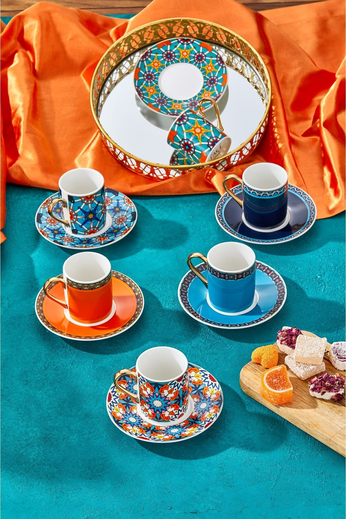 Paçi Eleganza 6'lı Kahve Fincanı Takımı, porselen malzeme ile üretilmiş ve uzun ömürlü kullanım sunar. Şık geometrik tema ve renkli tasarımı ile modern mutfak dekorasyonuna mükemmel uyum sağlar. Aile yemeklerinden arkadaş toplantılarına kadar her türlü etkinlik için ideal bir seçimdir.