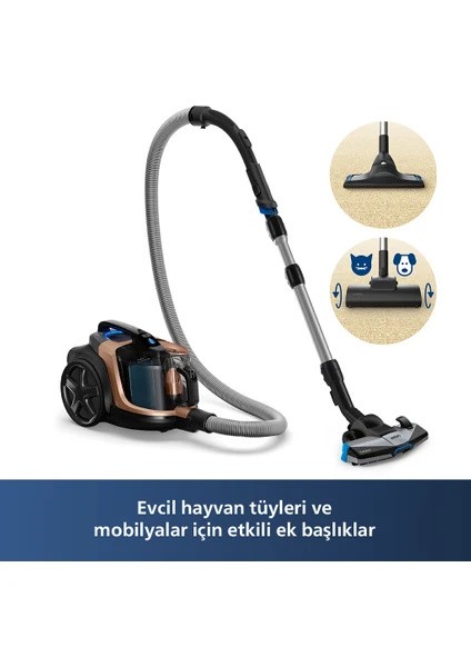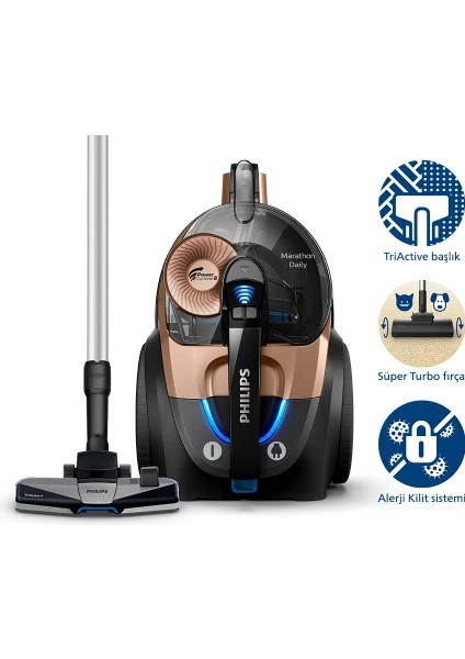 Philips Marathon Daily XB7151/07, güçlü 900 W motoru, PowerCyclone 8 teknolojisi ve HEPA filtreleme sistemi ile evdeki tüm kirleri etkili bir şekilde temizler. Alerji Kilit Sistemi ve yıkanabilir filtre gibi hijyenik özellikleri, özellikle alerjik kişiler ve evcil hayvan sahipleri için mükemmel bir çözüm sunar. TriActive+ ve Turbo başlıklar, her yüzeyde ve zemin tipinde yüksek performans gösterir.