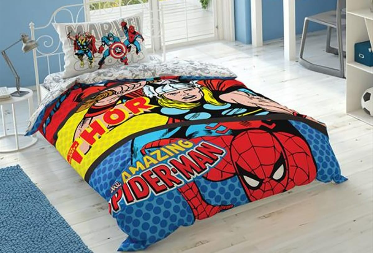 Marvel Comics lisanslı pamuk nevresim takımı, çocukların süper kahraman dünyasına adım atmasını sağlar. Nevresim takımı konforuyla uyku keyfini artırırken, Taç kalitesi ve Çelik Kardeşler VIP güvencesiyle ebeveynlerin içi rahat eder.